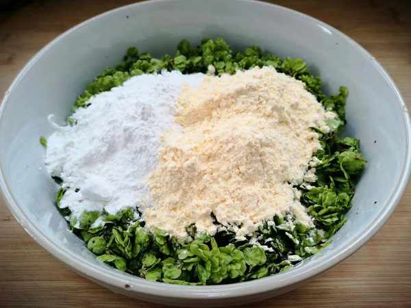 食材:榆錢,鹽、玉米面、白面。