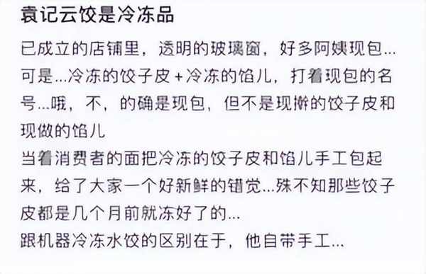 正是因為抱有這樣的消費預期,所以當袁記雲餃被曝出“皮和餡都是凍品”之後,不少人會大跌眼鏡。網友在曝光帖子裡提到,袁記雲餃“當著消費者的面把冷凍的餃子皮和餡兒手工包起來,給瞭大傢一個好新鮮的錯覺……殊不知那些餃子皮都是幾個月前就凍好瞭的”。