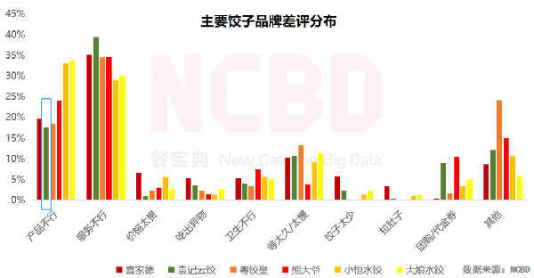 而根據消費者的反饋來看,很多人其實並不覺得袁記雲餃的產品有多大問題。NCBD(餐寶典)的《中國餃子行業發展研究報告》顯示,在幾個主要餃子品牌中,袁記在產品方面的差評比例最低。