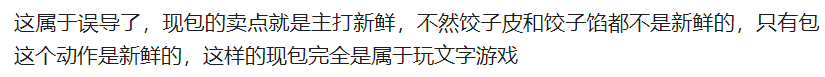 不出意外,有網友直言袁記雲餃是在“玩文字遊戲,誤導消費者”。在他們看來,既然號稱“現包”,那就肯定是現和的面、現搟的皮、現剁的餡,這點不用懷疑,也不必討論。他們斷然不會想到,“現包”的餃子用的是保質期長達幾個月的餡料。——這顛覆瞭他們的認知,讓他們感到上當受騙。