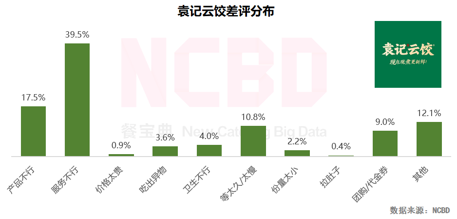 根據NCBD(餐寶典)的《中國餃子行業發展研究報告》,袁記雲餃除瞭服務方面的差評較多以外,在“吃出異物”方面的差評比例也較高,在6個主要餃子品牌中排名第二。