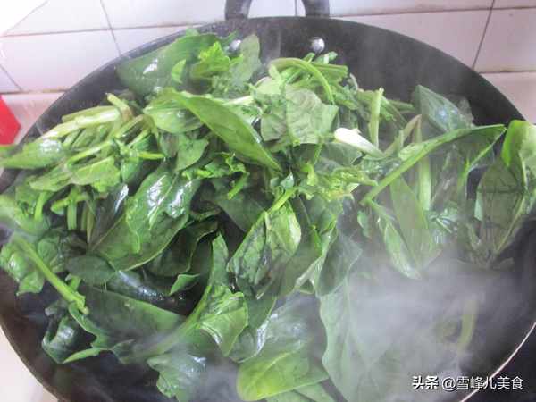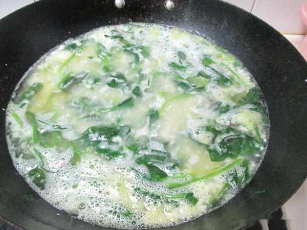 第三步:倒入菠菜煸炒均勻,倒入適量的清水,大火燒開。趁著這個時間,我們去做面疙瘩。