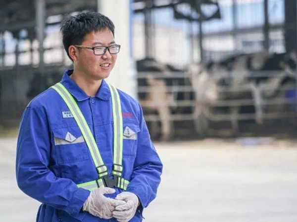 這是90後養牛官朱宗明,在他的努力下,牧場裡的每一頭奶牛都能查到系譜檔案,還配備瞭專屬營養師。
