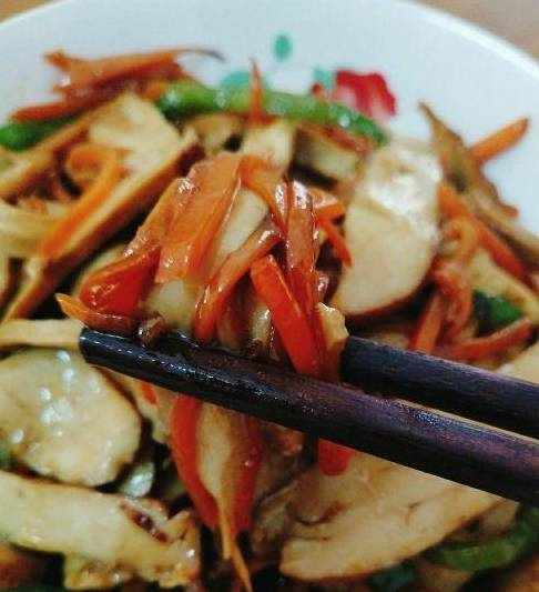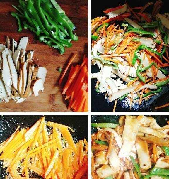 然後把胡蘿卜切成細絲,越細越好,是時候考驗刀功技術瞭呢。然後豆幹切成薄片。青椒切絲待用。鍋裡放油,油溫七成熱的時候把胡蘿卜先放進去爆炒。炒軟後再放豆幹和青椒絲。因為豆幹是熟的,所以不需要炒太久。大火爆炒一下就可以瞭。放點生抽,在放點耗油。最後放雞精調味!因為生抽和耗油都是咸的。所以不需要再額外放鹽的。(當然瞭,如果口味比較重,可以根據自己喜好來調整的呢)!