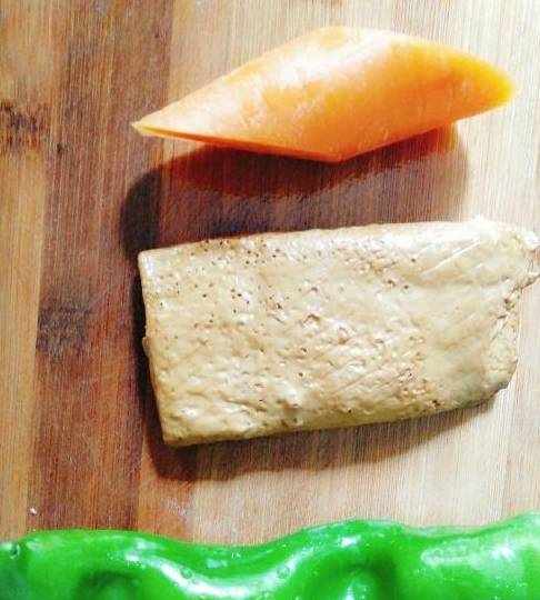 首先準備食材:適量的胡蘿卜,豆幹一塊,青椒一個。