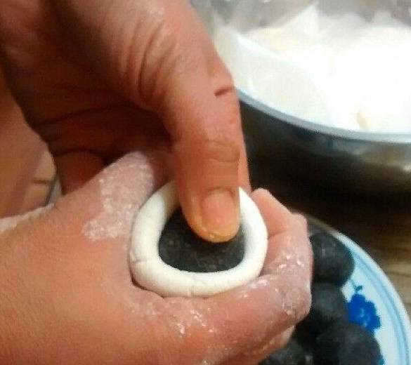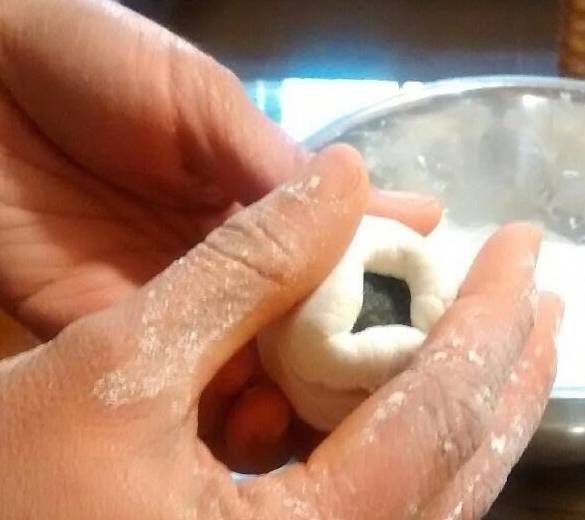 將餡料放入,左手按住餡料,右手拇指食指配合慢慢收緊。