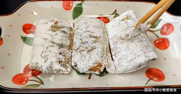 3、然後準備一些淀粉,把醃好的帶魚放上來,裹上一層生粉。放到盤子裡面備用。