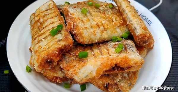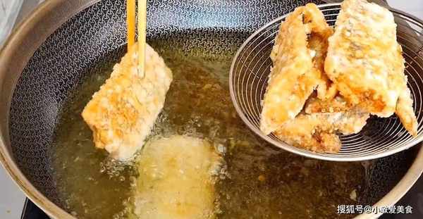 5、然後把油溫升到九成熱,再復炸一次。全部放進來之後,多翻動幾下,最後把帶魚的兩面炸至金黃色,用漏勺控油撈出來,這樣做出來的帶魚金黃酥脆,吃著不腥,而且外酥裡嫩。