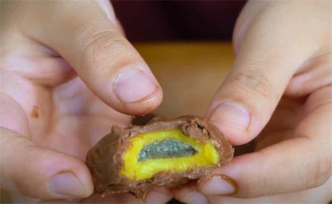 7.我剛才咬瞭一口,外面這一層巧克力皮脆脆的,平常咱們的雪糕也是這樣做,裡面的口感就是比較接近於糯米糍,涼涼的,吃起來糯糯甜甜的,超級好吃。