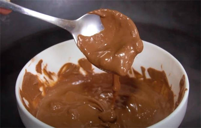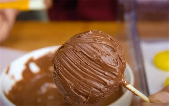 6.這個是咱們剛才做好的巧克力漿,把這個湯圓在裡面蘸一下,滾一圈,如果裹得不均勻,就用這個刷子給它刷兩下,靜置上兩三分鐘,外面這一層巧克力又凝固瞭。