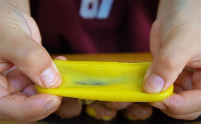8.還剩兩個沒有裹巧克力漿的,這個冷凍起來,外面一層糯糯的涼涼的,就相當於一個糯米糍瞭,給大傢看一下這個細節,放涼之後能看到它這個外皮的筋性特別大,所以說吃起來比咱們煮著吃的口感會更好,如果大傢喜歡吃湯圓的話,可以試試這兩種做法。