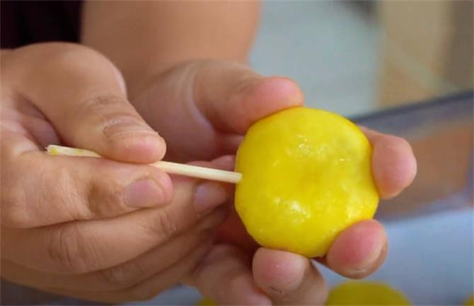 5.這個湯圓凍好瞭,凍得很結實,再準備上一個小簽子,用牙簽也可以,直接穿過去。