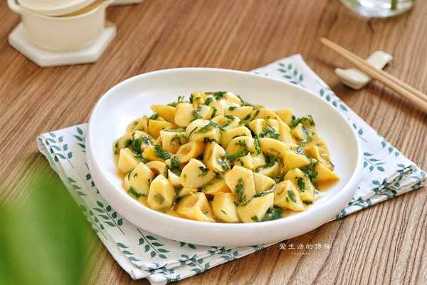 將春筍肉入鍋焯水至熟,冷卻後切滾刀塊,薺菜洗凈焯水切碎備用。鍋中加油,把春筍倒入中火慢慢煸香。加水和老母雞濃湯寶後煮開轉小火燜入味,加入薺菜略煮後,淋水生粉勾芡裝盤即可。
