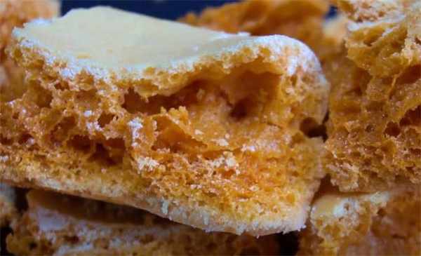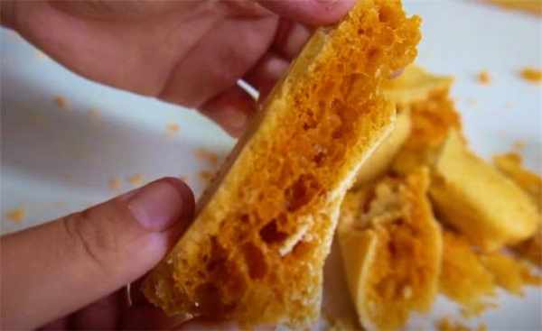 5.看一下裡面這個蜂窩狀,全是小氣孔,這次做的這個蜂窩糖是改良版本的,特別的酥,這個直接吃起來太甜瞭,大傢可以泡咖啡的時候,或者是喝牛奶的時候加上一些,這樣會有點焦糖的味道,喜歡的朋友趕緊做起來吧。