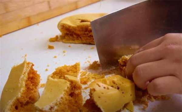4.咱們的蜂窩糖就做好瞭,用刀敲碎成小塊。