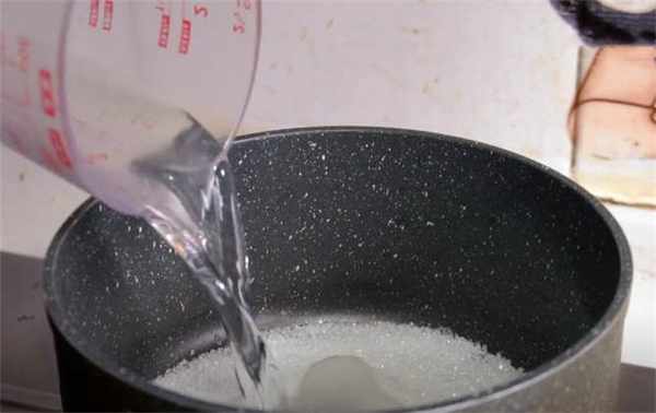 1.奶鍋裡面倒上200g的白砂糖,再來100g的清水,咱們直接開小火,開完火之後別動它,要不然特別容易反沙,就這樣讓它慢慢熬就行瞭。