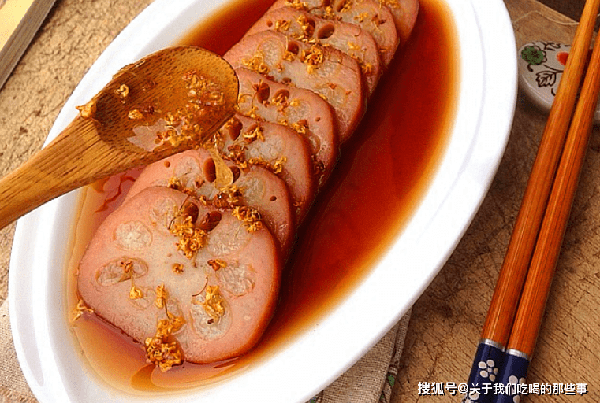 4、取出糯米藕稍微晾一會兒,切成薄片後擺入盤中,澆上一些煮蓮藕的紅糖水,再淋上桂花蜜,就可以吃瞭,補氣血特別好。