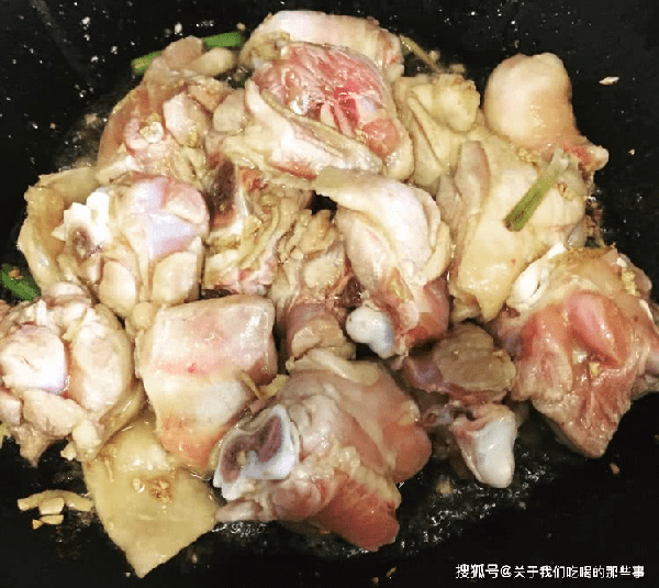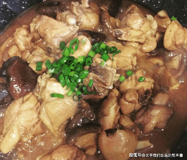 3、放入香菇塊翻炒一會兒,加入適量食鹽、生抽、蠔油,炒勻後倒入開水,小火燉20分鐘。雞肉燉熟後開大火收汁,撒上蔥花即可出鍋。