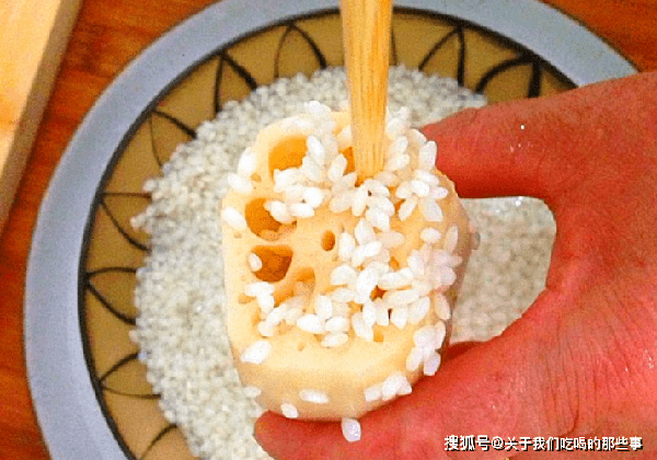 1、糯米提前用水浸泡3小時,淘洗幹凈後瀝幹水分。蓮藕去皮洗幹凈,把一頭切掉2厘米,露出藕孔即可,把泡好的糯米塞進藕孔裡,用筷子捅一捅,塞緊實一些。