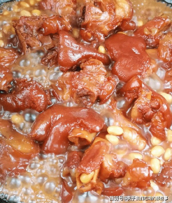 3、放入適量生抽、老抽翻炒均勻,加入適量啤酒沒過豬蹄,放適量食鹽,大火煮開後放入泡好的黃豆,小火燉40分鐘。豬蹄和黃豆燉爛後,撿出香料扔掉,開大火收汁,湯汁濃稠後即可出鍋。