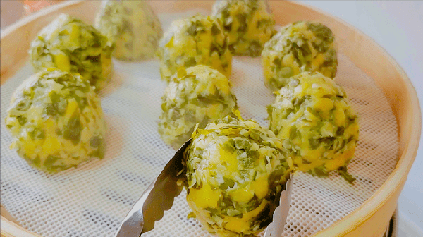4、鍋中倒進適量的清水,放上2個雞蛋,放上籠屜,擺上矽膠墊,整齊的擺放上做好的窩窩頭,大火燒開蒸8分鐘,燜2分鐘,美味的枸杞芽窩窩頭就做好啦!掀開鍋蓋那一刻,一股淡淡的野菜香味撲鼻而來,金燦燦的小可愛讓人看著有食欲呀!夾出來備用。