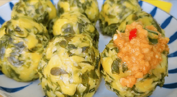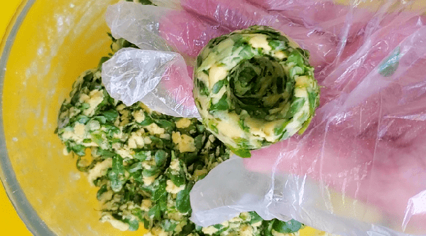 3、然後多次少量的加入玉米面和面粉,攪拌均勻,讓枸杞芽均勻的粘裹上面粉和玉米面,直到能把枸杞芽抓成團,然後團成球,用拇指在中間按一個小窩窩,做成窩窩頭的形狀。