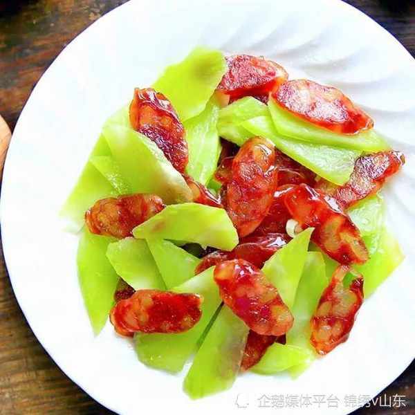 4、再倒入萵筍快速翻炒即可關火出鍋,不用另外放鹽,臘腸裡已含有咸味。
