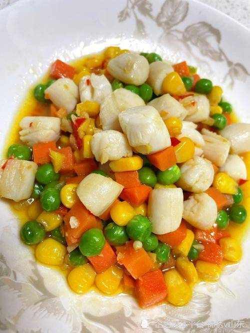 食材準備:豌豆、扇貝柱、胡蘿卜、玉米、薑蒜末、小米辣。