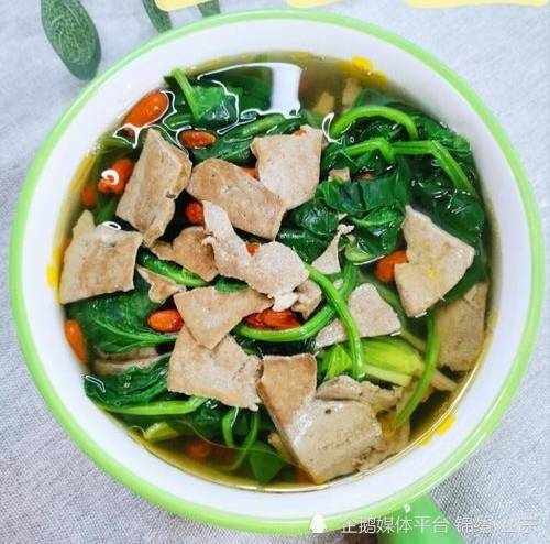 2,鍋裡放入花生油,入蔥薑爆香,倒入菠菜炒勻,加入開水燒開,把豬肝一片一片放入煮開,加入適量的鹽,雞精,胡椒粉調味,出鍋即成。