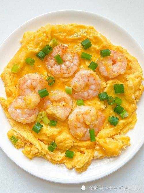 5、再次起鍋燒油,油熱後放入雞蛋液蝦仁,開小火慢慢煎,稍微定型後,用鏟子慢慢往中間推動,煮熟即可出鍋,撒上蔥花即可上桌開吃。