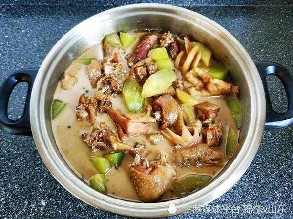 2、鍋內註入油燒熱,放蔥薑塊煸香,放入氽好水的臘雞,待水開後倒入沙鍋中,小火燉約25分鐘,調入味精、雞精,再放入胡蘿卜和萵筍燉至熟爛即可。