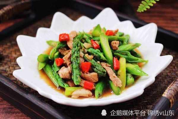 食材:蘆筍,豬肉,大蔥,蒜,料酒,生抽,淀粉,鹽,雞精,花生油。做法:1.先把豬肉沖洗一下,控幹表面的水,再把它切成薄薄的片,放入一個大碗中,在裡面倒入料酒,生抽,鹽,雞精,抓拌均勻之後再放入兩勺玉米淀粉,繼續抓勻醃制15分鐘,讓豬肉入味。2.把蘆筍清洗幹凈,去掉根部硬硬的一段,然後切成兩厘米左右,清洗幹凈之後放入沸水中焯水兩分鐘,撈出來控水備用。3.起鍋燒油,油溫6成熱,先放入肉片炒至顏色變為焦糖色,再放入蔥和蒜去爆香,倒入蘆筍,加入鹽,料酒,繼續翻炒均勻。4.炒熟食材之後,最後撒上一小撮雞精,翻拌均勻即可出鍋裝盤。