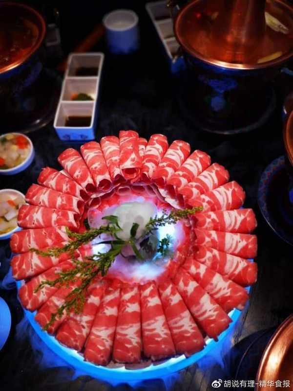 吃傳統的銅鍋涮肉,尤其是得試試這個鮮切的羊肉,比如這個羊後腿兒,首先最基礎的,立盤不倒,而且無論擺上桌多長時間,都是倍利落幹松,不滲血水,這就是好羊肉的一個標志。