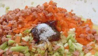 2.再加上其他配菜,我加瞭點胡蘿卜碎、西葫蘆碎、火腿碎、也可以加上你喜歡吃的其他食材。加一勺生抽、一勺蠔油、一勺鹽即可,攪拌均勻。