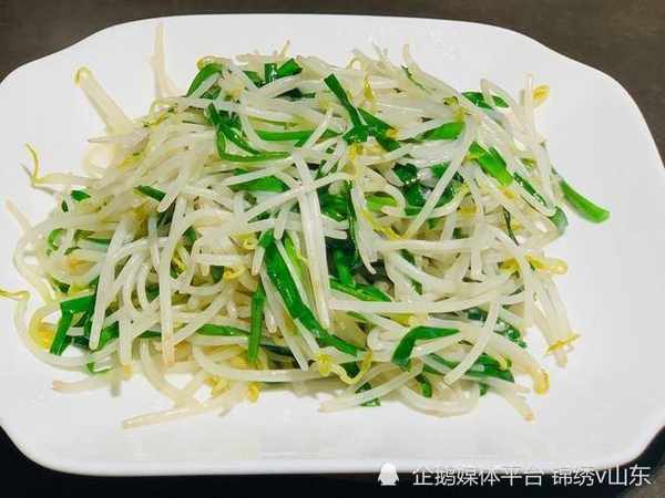 ②韭菜提前用水洗幹凈,切成小段。等綠豆芽顏色炒到透明的時候,倒入韭菜,開大火炒。