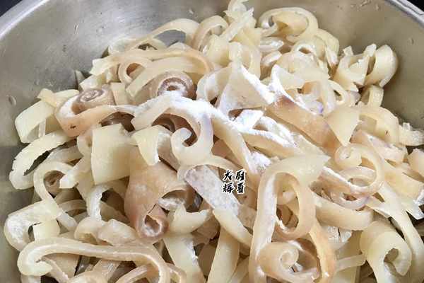 3、肉皮放入盆裡加入一小匙食用堿和鹽,放入少許清水,用力抓洗肉皮,再用流動水沖洗兩到三遍,將肉皮撈出瀝幹水分備用。