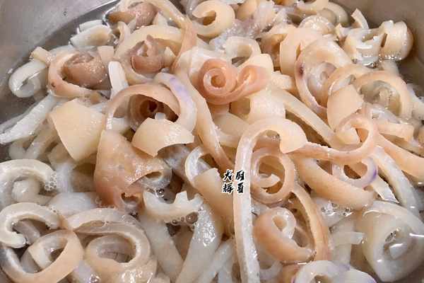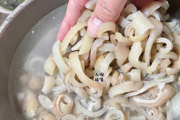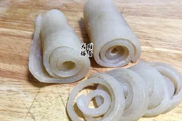 2、開鍋後轉中火煮三分鐘左右,肉皮回軟後撈出瀝幹水分。剔除肉皮裡面的油脂,檢查肉皮表面有無殘留的豬毛並去除幹凈。將肉皮再次放入鍋中煮四五分鐘後取出切成條狀。