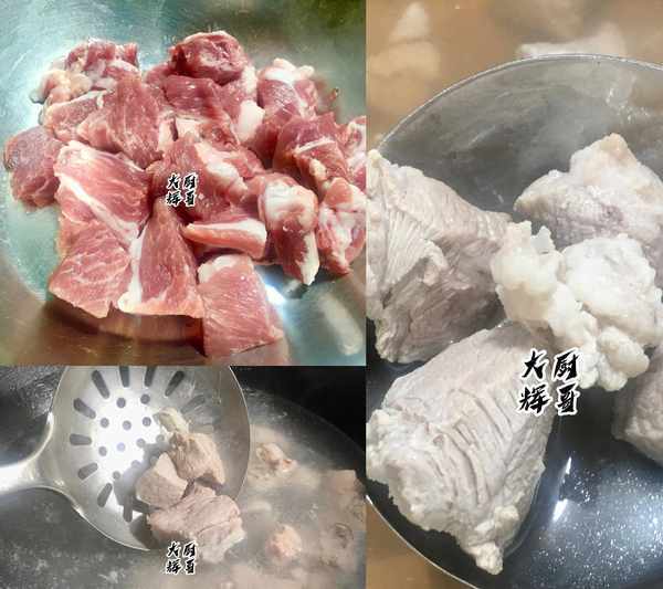 三、把豬瘦肉改成三四厘米大小的塊,用清水洗凈。把瘦肉放入清水鍋裡焯水,去除血沫,再煮三分鐘後撈出,洗凈豬肉表面的浮沫。