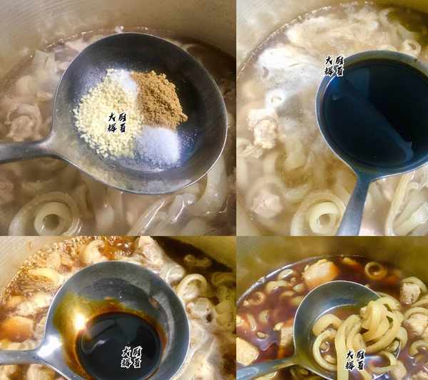 六、放入適量醬油、鹽、味精、雞精、十三香調味,加入少許料酒去腥,倒入少許老抽調色。