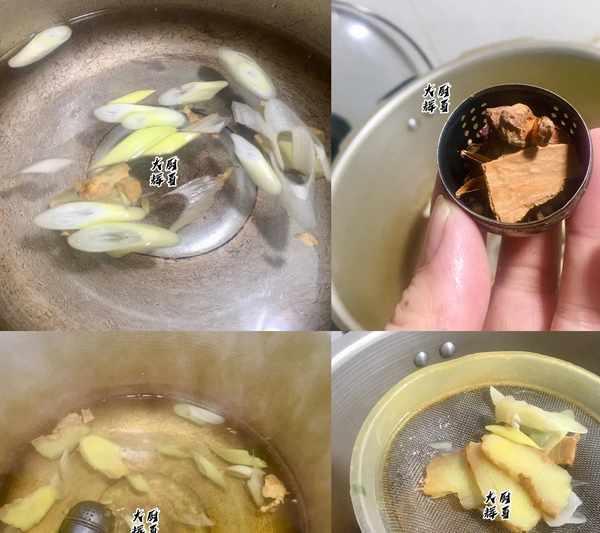 四、準備好高壓鍋加入適量清水,放入蔥段、薑片和料盒,煮四分鐘左右。湯汁有茶色時撈出蔥薑不用。