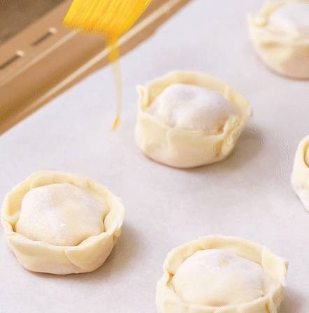 拌好的紅薯餡兒放到餃子皮上,塗上蛋黃液,再撒黑芝麻點綴,烤出來會有一層嫩黃微焦的蛋皮,更好看也更好吃。