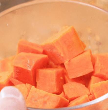 4.蒸好後紅薯碾壓成泥,趁熱加入糖和牛奶,攪拌成泥。