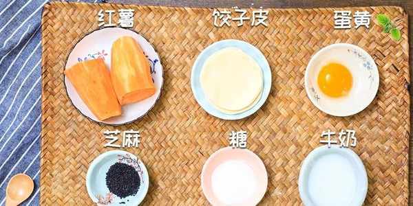 1.準備食材:糖:5克,蛋黃:1個,牛奶:20克,紅薯:200克,黑芝麻:適量,餃子皮:12張