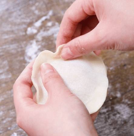 5.挖一勺紅薯餡放在餃子皮上,在邊緣抹一圈清水。蓋上另一張餃子皮,捏緊邊緣。