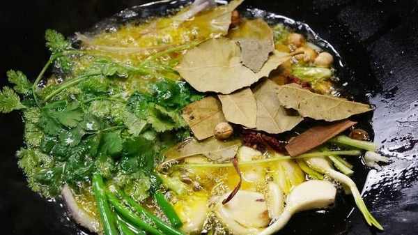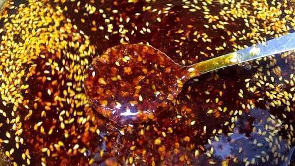 辣椒面做好後,將辣椒面放入不銹鋼盆中,加入少許十三香和花椒面,再加入適量的白芝麻。下一步是炸油。煎炸油不僅是菜籽油,還需要準備一些香菜、細香蔥、洋蔥、八角、月桂葉、胡椒、生薑、大蒜和桂皮,然後將所有這些材料放入鍋中,炒至微焦然後把它們拿出來。