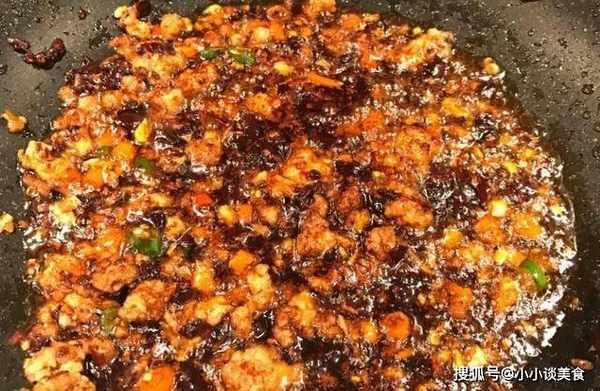 豆腐焯水後,就可以開始炒瞭。首先準備一些肉末。你不需要醃碎牛肉。將油放入鍋中。油熱後放入薑、蒜炒香。然後將肉末倒入鍋中翻炒。炒好後加入豆沙和黑豆沙,翻炒均勻,再加入適量的水。