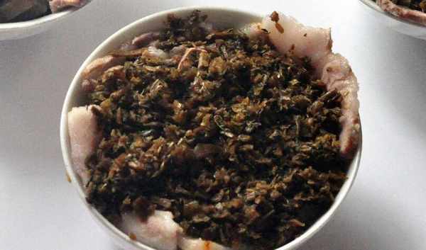 然後就可以開始蒸瞭,準備一個碗,然後把切好的肉皮鋪在碗底,然後取一勺調好的汁澆在肉塊上,再鋪上炸好的芽菜。肉塊,放入蒸鍋蒸一個小時。