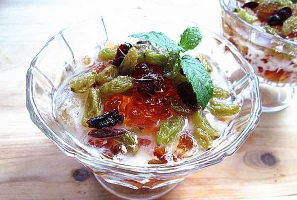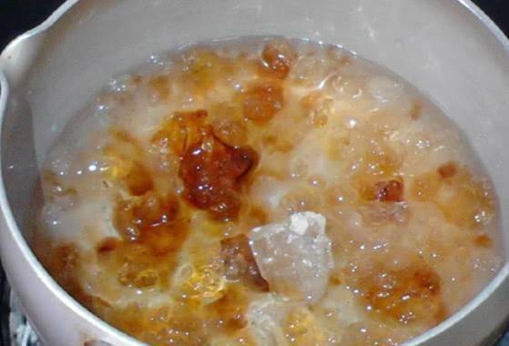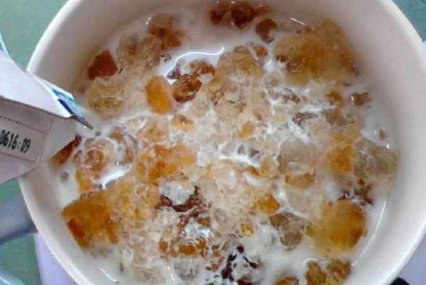 第四步:在煮桃膠的時候,加入一些冰糖,這樣煮出來的桃膠口感會更好。桃膠煮好後,將牛奶倒入鍋中,然後用小火燉15分鐘待用,再加入一些羽扇豆和葡萄幹再煮5分鐘左右,味道會更好!