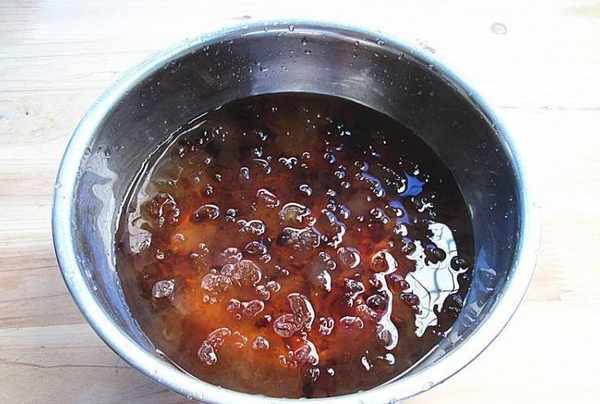 第二步:將桃膠挑選洗凈備用,瀝幹水分,方便以後使用。每個人都必須在前一天處理桃膠,因為浸泡桃膠需要56個小時。桃膠泡發後,將準備好的枸杞子和葡萄幹用清水沖洗幹凈,再泡10分鐘左右。