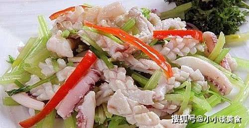 材料:鮮魷魚、芹菜、紅辣椒、薑3片、鹽2g、檸檬汁、料酒、香油
